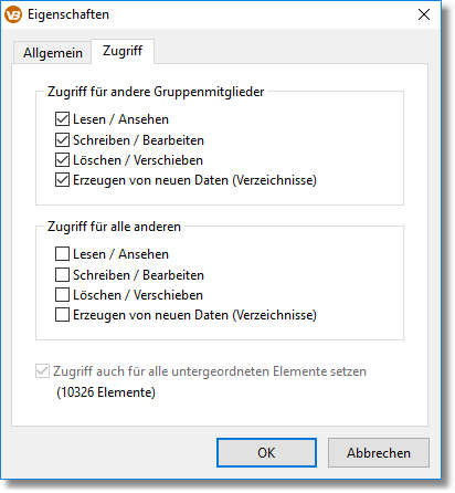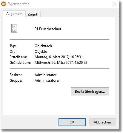 Wenn die Änderungen erfolgt sind, verschwindet der Dialog ohne eine weitere Meldung. - Rufen Sie nun im gleichen Datenbereich 01 Feuerbeschau noch mal den Eigenschaften Dialog auf und wechseln Sie auf den Kartenreiter "Zugriff"