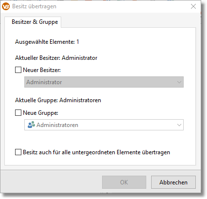 - Ein Administrator kann den Besitz des Objektes an einen anderen Benutzer übertragen.