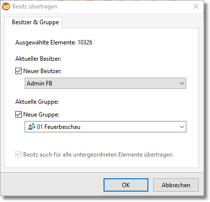 - WICHTIG: Setzen Sie das Häkchen "Besitz auch für alle untergeordneten Elemente übertragen".