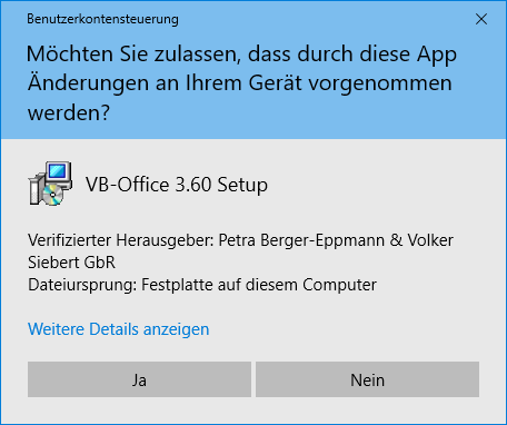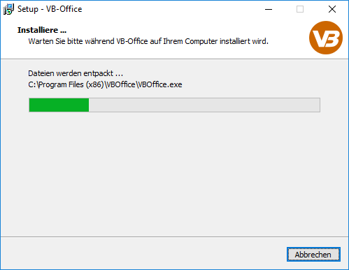 VB-Office wird über ein Standard-Installationsprogramm auf dem Client-Rechner installiert. Dieses Programm wird aus dem Explorer per Doppelklick bzw. über die Kommandozeile aufgerufen. Für die Installation werden lokale Administrator-Rechte benötigt, die das Installationsprogramm, falls erforderlich, mit einem sog. UAC-Prompt einfordert.