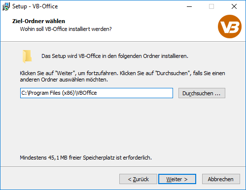 Hinweis: Wenn VB-Office bereits installiert ist und es sich somit um ein Update handelt, dann wird das Verzeichnis nicht abgefragt (da es schon feststeht).