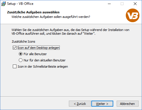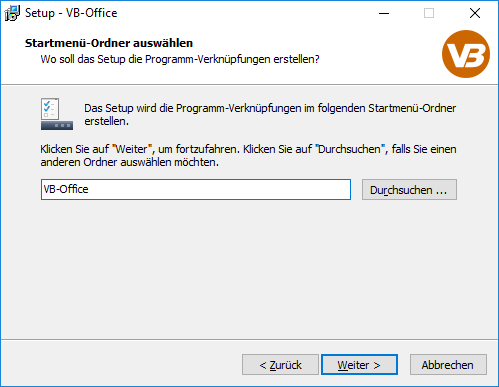 Hinweis: Wenn VB-Office bereits installiert ist und es sich somit um ein Update handelt, dann wird der Startmenü-Ordner nicht abgefragt.