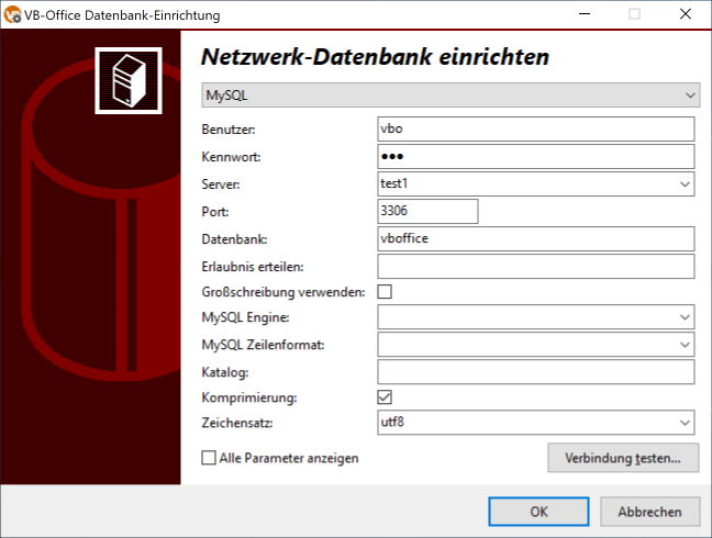 Die Details zur Konfiguration der unterschiedlichen unterstützten Datenbanken sind jeweils in den separaten Dokumenten „VB-Office Datenbank“ für Oracle, SQL-Server bzw. MySQL beschrieben.