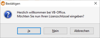 Beim Start überprüft VB-Office das Vorhandensein des Lizenzschlüssels in der Datenbank. Ist dieser nicht eingetragen, dann wird er beim Programmstart erfragt:
