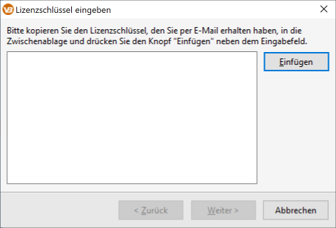 Beantwortet man diese Frage mit Ja, dann muss der Lizenzschlüssel über die Zwischenablage an das Programm übergeben werden: