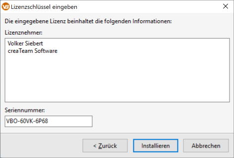 Abschließend wird durch Betätigung des Knopfes Installieren der Lizenzschlüssel in der Datenbank abgelegt.