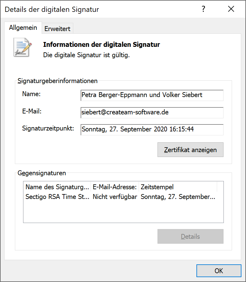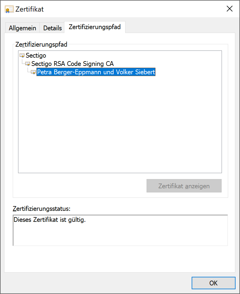 Sowohl das Installationsprogramm als auch alle installierten Programme und Bibliotheken, die von der Firma creaTeam Software stammen, sind digital signiert. Das Code-Signing-Zertifikat wurde von der Firma Sectigo ausgestellt (https://sectigo.com/), das verwendete Root-Zertifikat sollte auf Computern mit aktuellem Windows-Betriebssystem vorhanden sein.